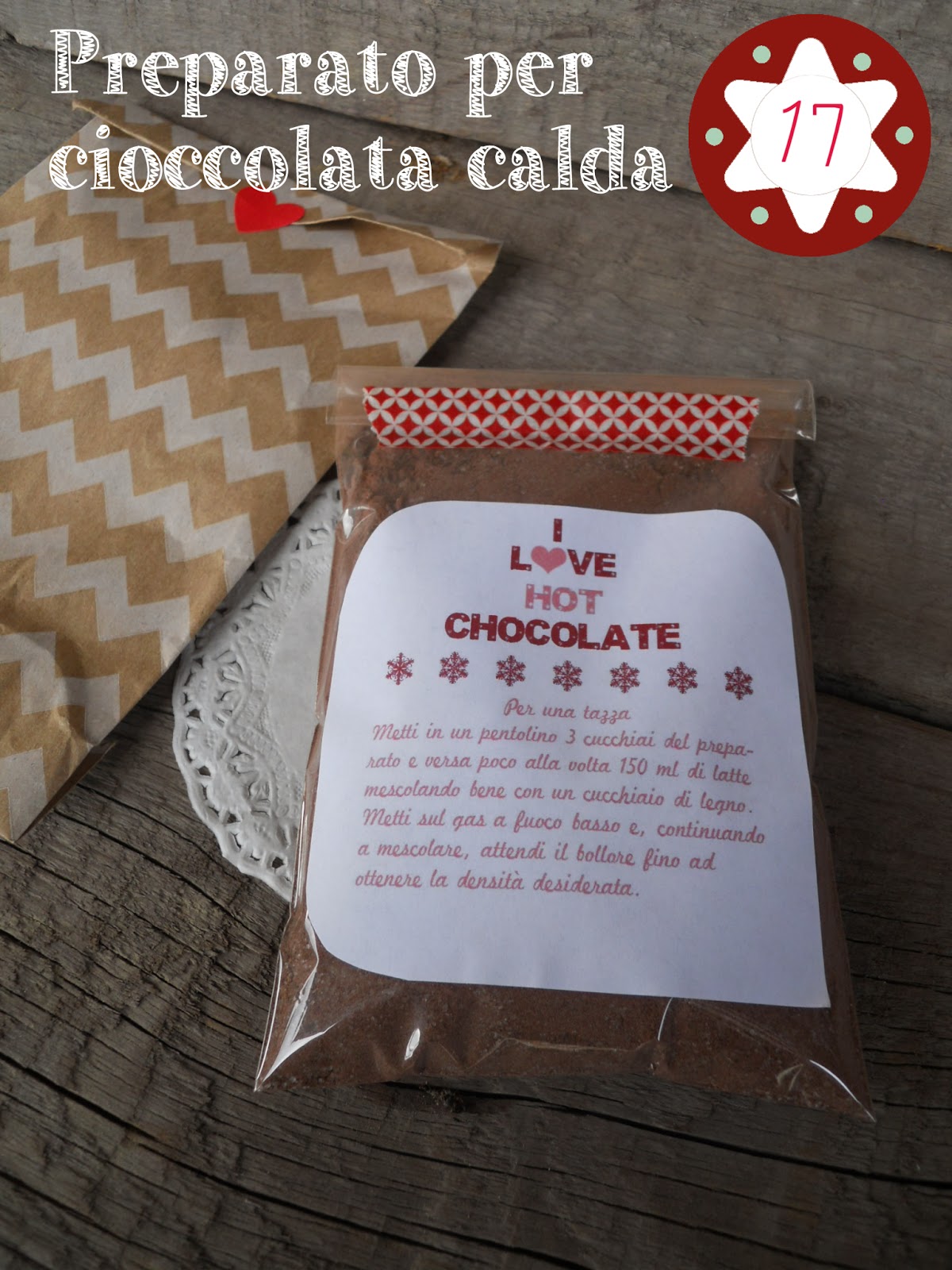 Potete confezionare il preparato in vasetto ma potete regalare anche delle monoporzioni utilizzando bustine per alimenti ed allegando un’etichetta con le istruzioni per preparare la cioccolata calda.